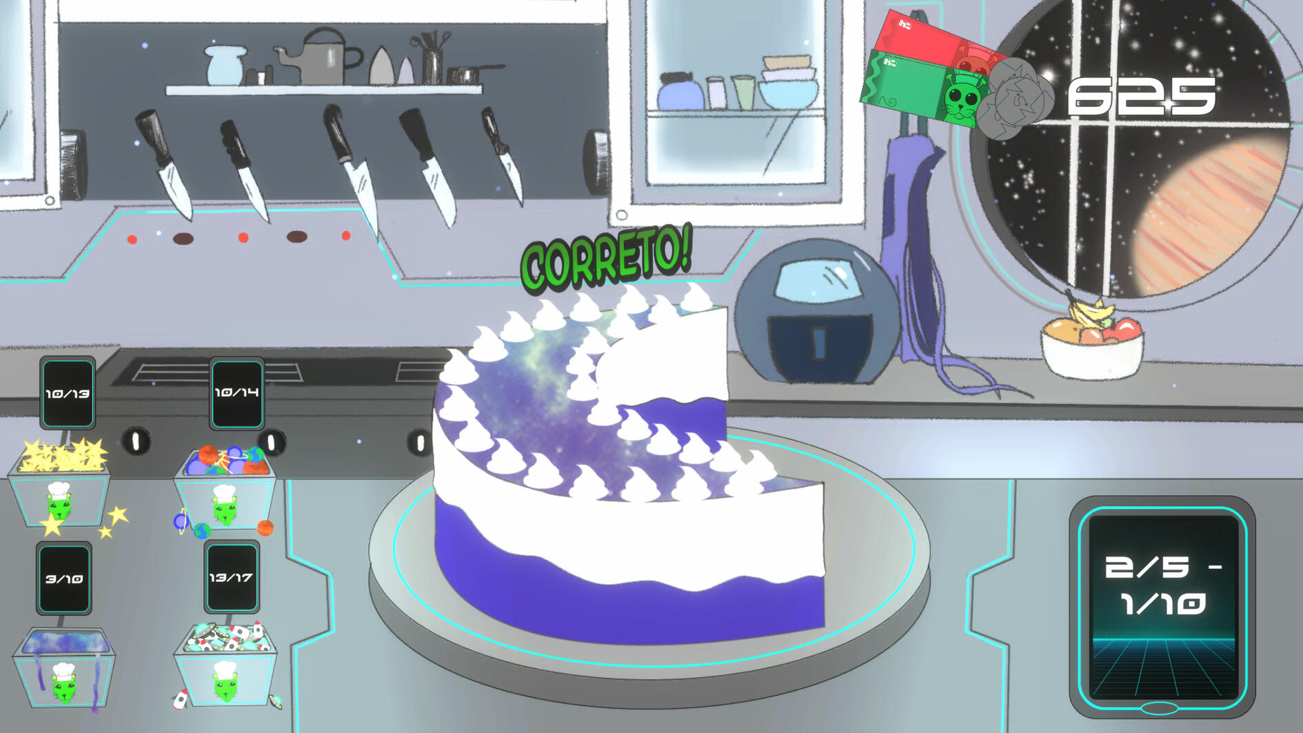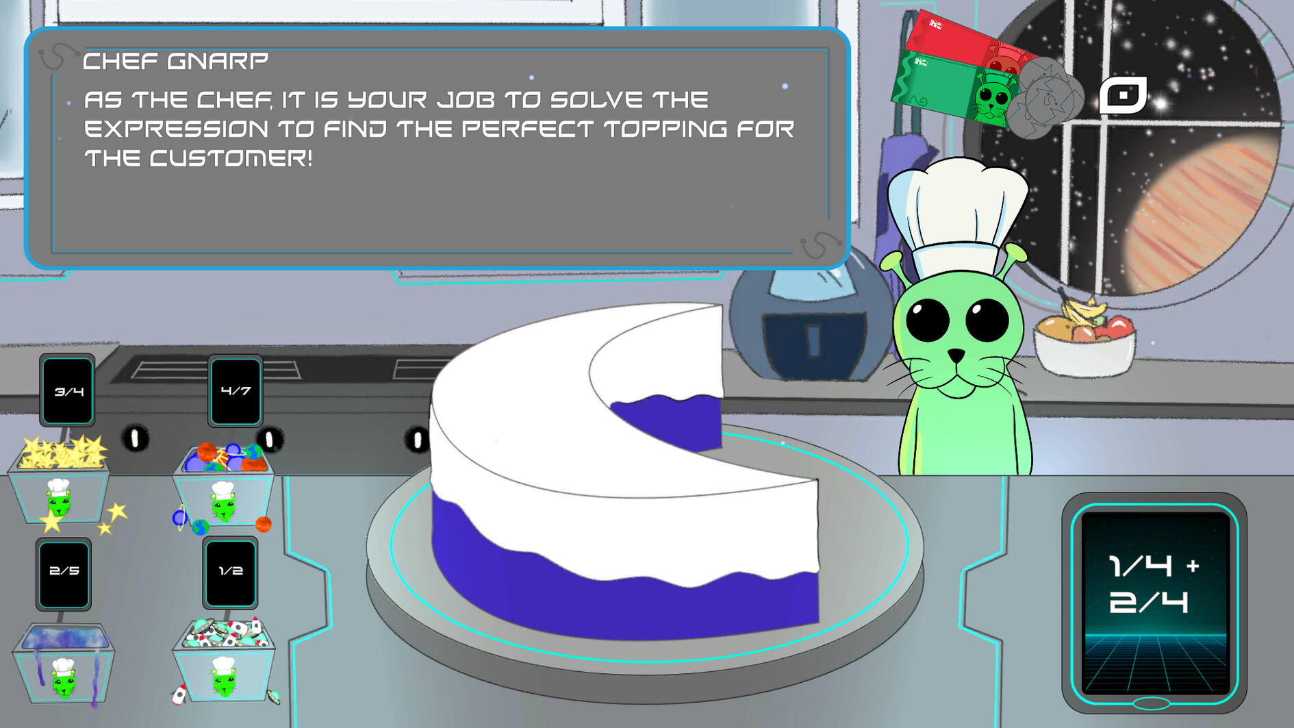 An educational Sci-Fi math game, help the alien seal Chef Gnarp at his bakery by solving fraction based equations! Put the correct decoration on the cake by solving math equations from customers.