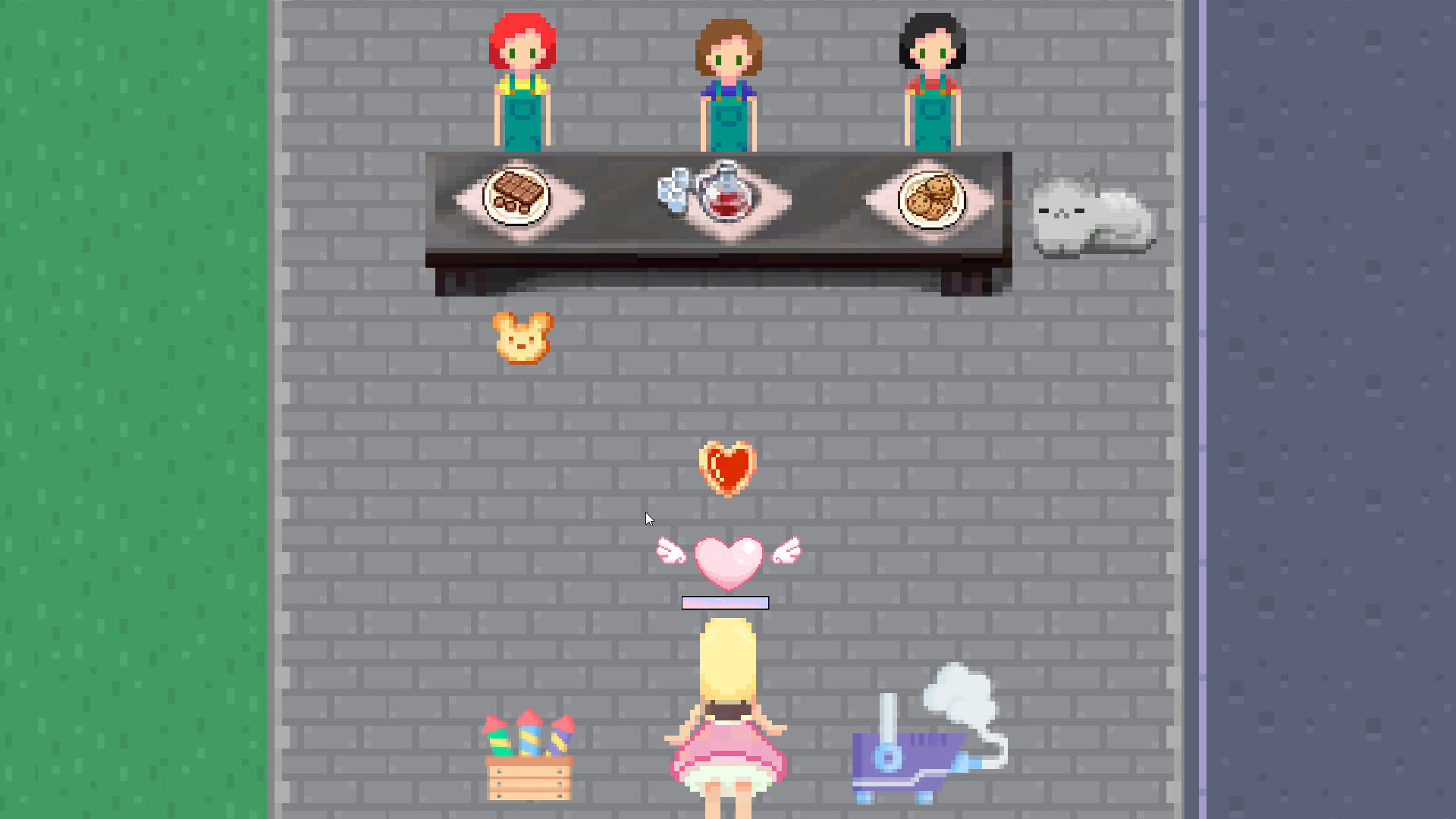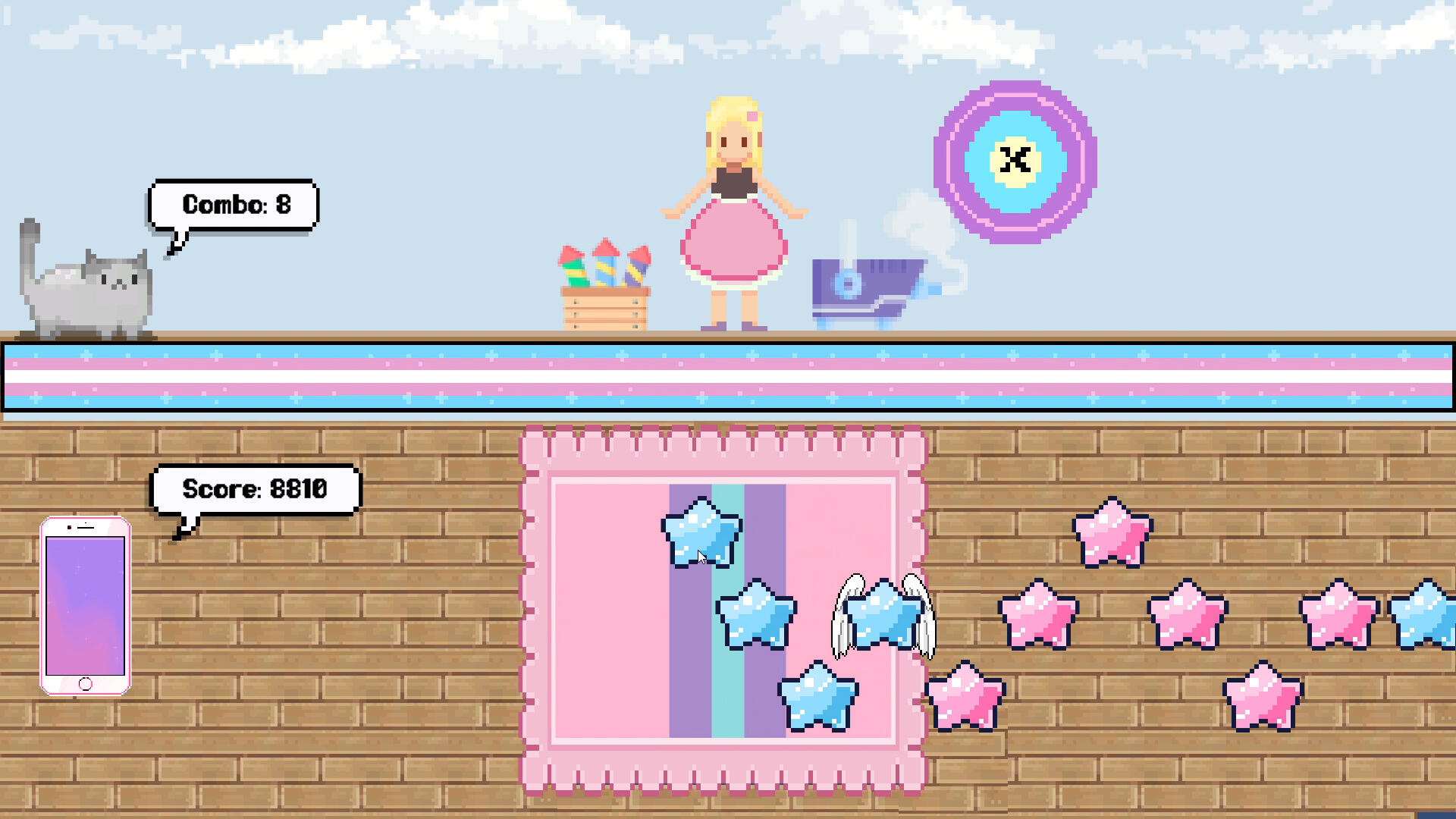 Dance Battles are the second state of gameplay where the player is deflecting cookies being thrown at them and their stage equipment. Rather than affecting the environment, the player is responding and reacting to what is happening around them.